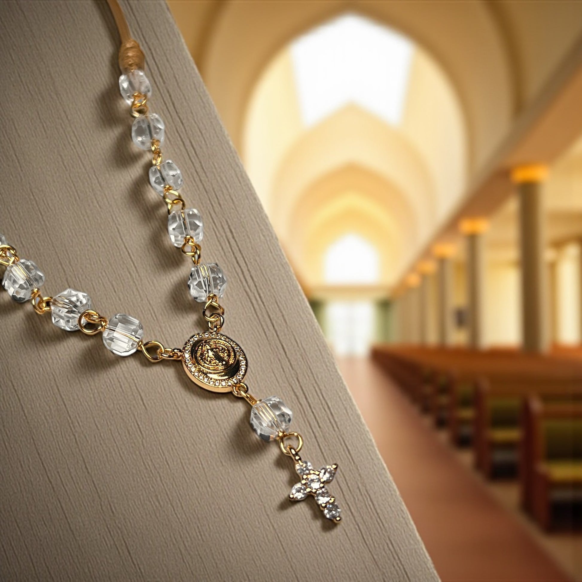 Hermoso y delicado decenario en cuarzo transparente. Gold Plated