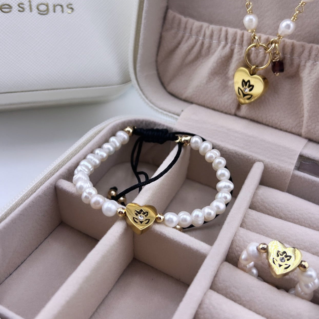 Hermosa Pulsera en perlas de agua dulce y nuestro emblematico corazon, ajustable con condon negro